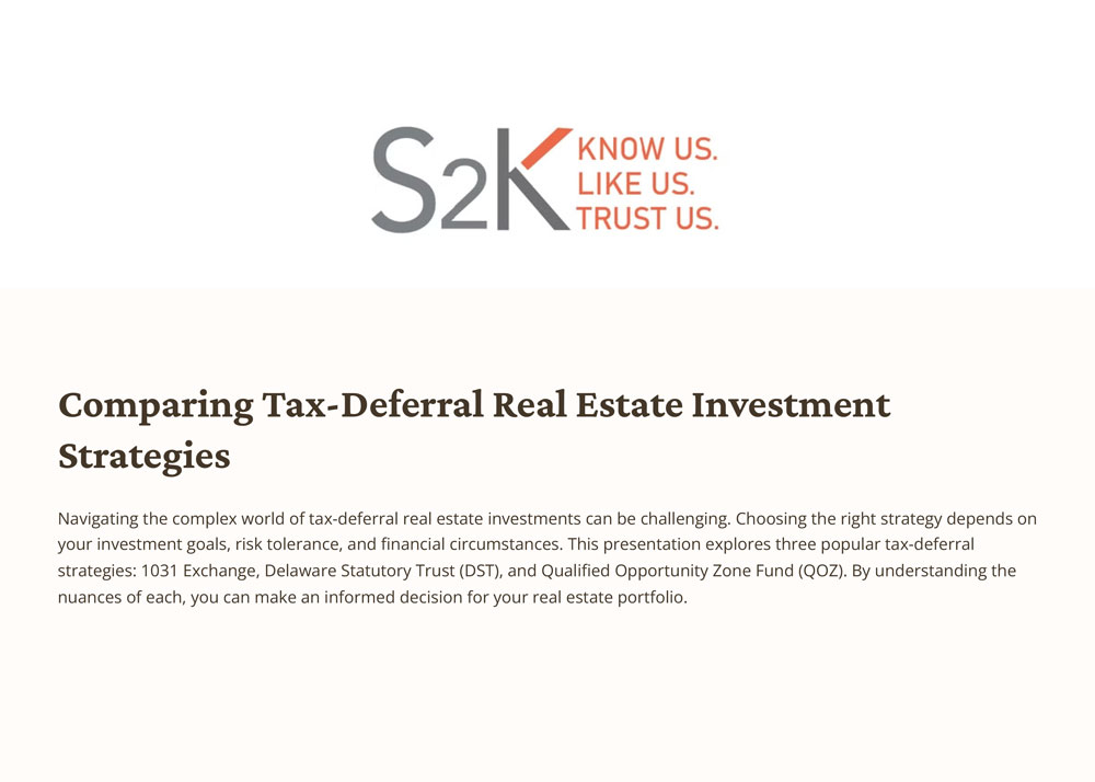 With over 100+ years of combined real estate investment experience, the S2K Miller Fund will focus on investing (directly or with asset-specialist Co-GP Partners) in real estate opportunities focusing on situations where the property provides a "roof over head" solution to its users and tenants.